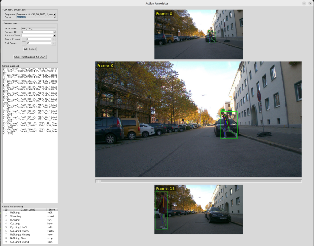 We developed a custom annotation tool because existing solutions are ill-suited for the precise temporal labeling of actions for multiple tracked individuals. The application presents an interactive three-frame view (start, middle, end) with a scrubbing slider, allowing an annotator to quickly verify and refine the duration of an action before assigning a class label.