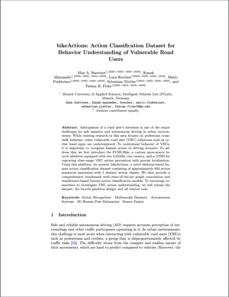 Using the FUSE-Bike, we created bikeActions, a new multimodal dataset focused specifically on urban human action recognition. The dataset addresses a key gap in the field: existing driving datasets lack fine-grained action labels, while general action datasets lack the context and sensor data of real-world traffic.