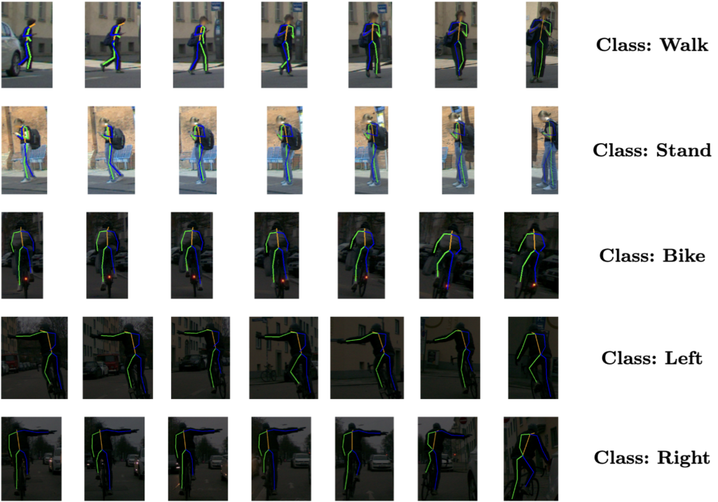 • Rich Annotations: We provide dense annotations for 9 action classes, including walk, stand, bike, left, right, and wave. Each sample includes 3D skeletons in the global coordinate frame.